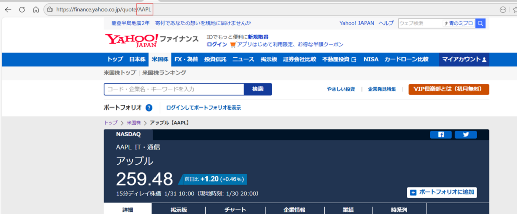 ②それぞれの株のページにアクセスして、URLを確認する。